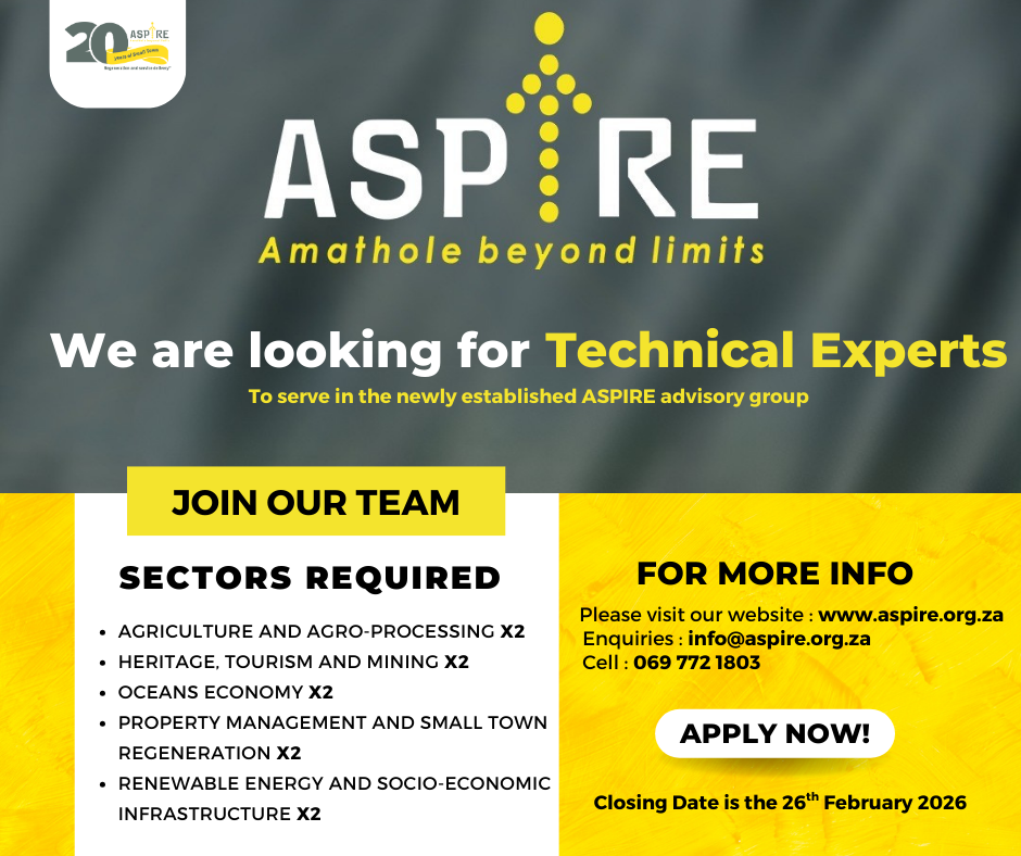 The Amathole Economic Development Agency t/a ASPIRE invites applications from experienced professionals to serve on its newly established Technical Advisory Group (TAG). This initiative aims to strengthen ASPIRE’s Strategic, Operational, and Governance capacity through expert guidance across Key functional Areas. We are seeking ten (10) sector professionals to serve on the TAG for a Fixed Term of three (3) years, providing Independent, High-Level advice to support ASPIRE’s mandate for inclusive economic development in the Amathole District region.